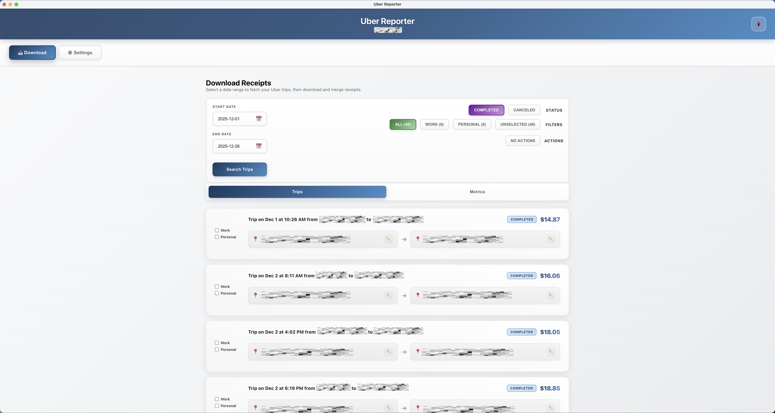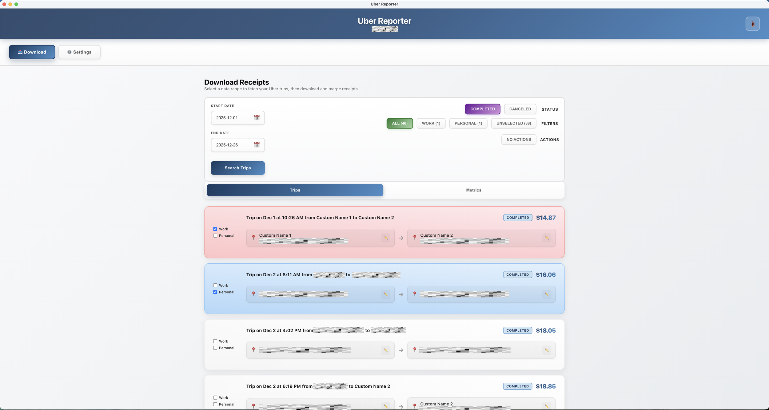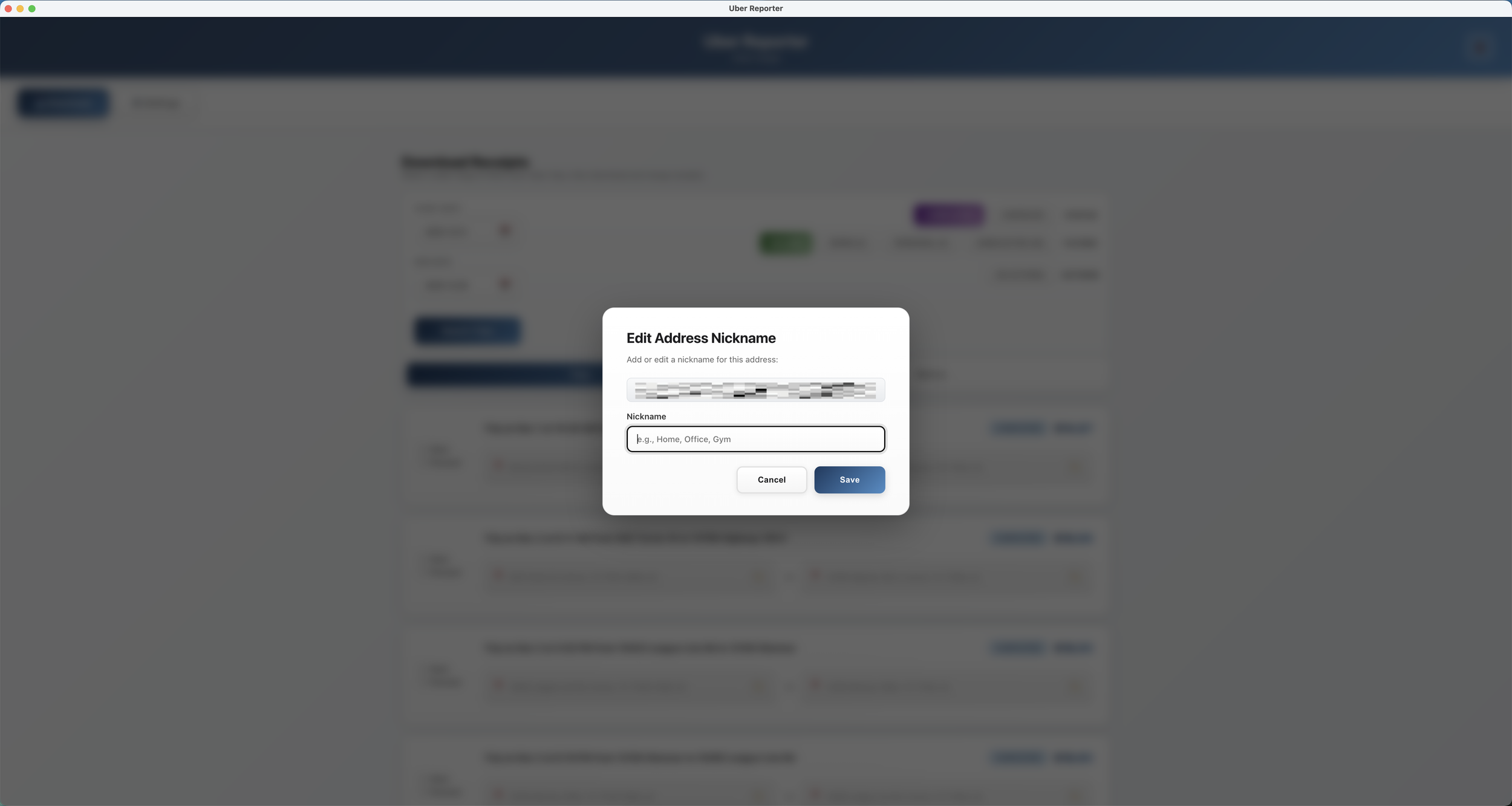Uber Reporter is a desktop application that helps users efficiently manage their Uber trip receipts and generate professional travel reports. It solves the problem of manually downloading individual receipts from Uber's website by allowing batch downloads across any date range. Users can categorize their trips as work or personal, create custom location aliases (naming an address "Home" or "Office"), and generate formatted PDF reports suitable for expense reimbursement. The tool is particularly valuable for business travelers, freelancers, and anyone who needs organized trip records for accounting purposes.