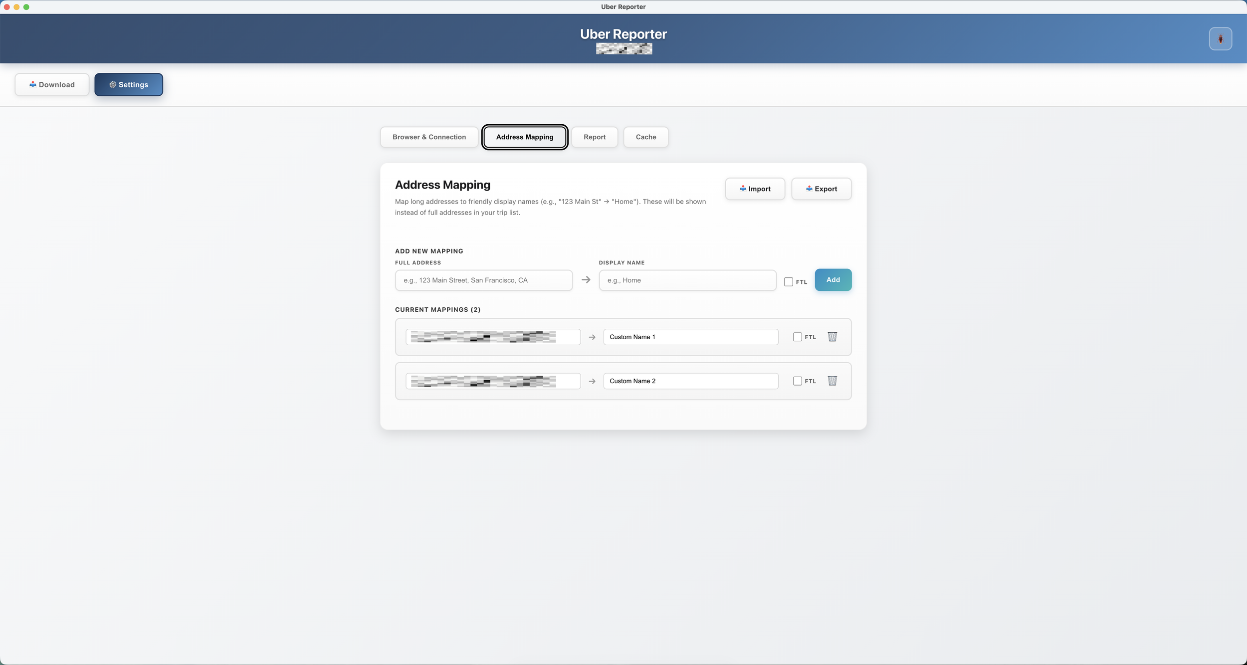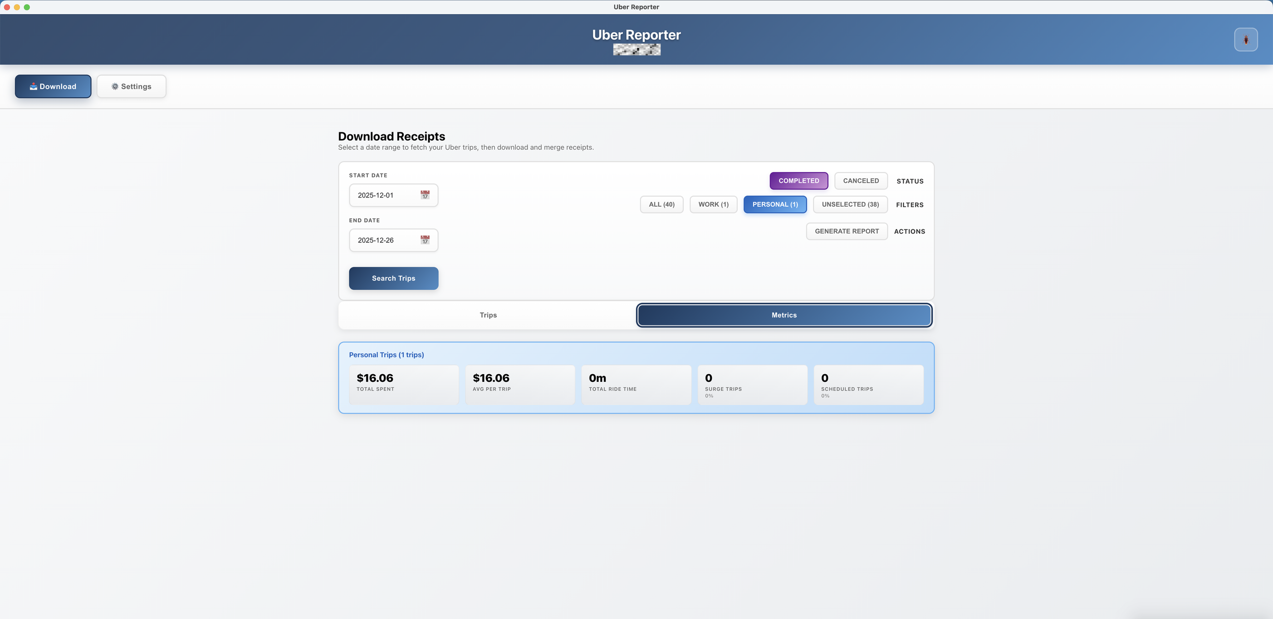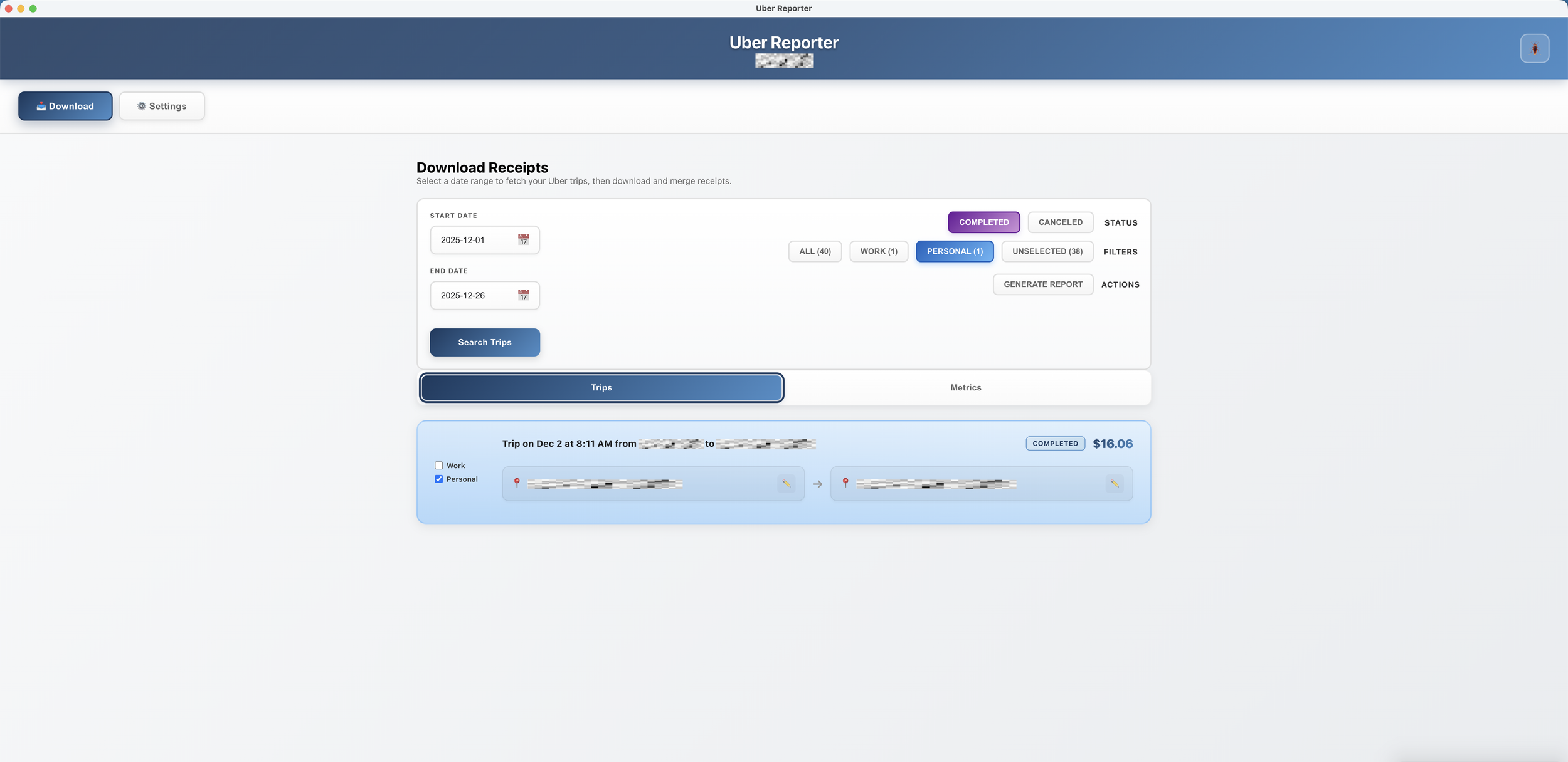 Uber Reporter is a desktop application that helps users efficiently manage their Uber trip receipts and generate professional travel reports. It solves the problem of manually downloading individual receipts from Uber's website by allowing batch downloads across any date range. Users can categorize their trips as work or personal, create custom location aliases (naming an address "Home" or "Office"), and generate formatted PDF reports suitable for expense reimbursement. The tool is particularly valuable for business travelers, freelancers, and anyone who needs organized trip records for accounting purposes.