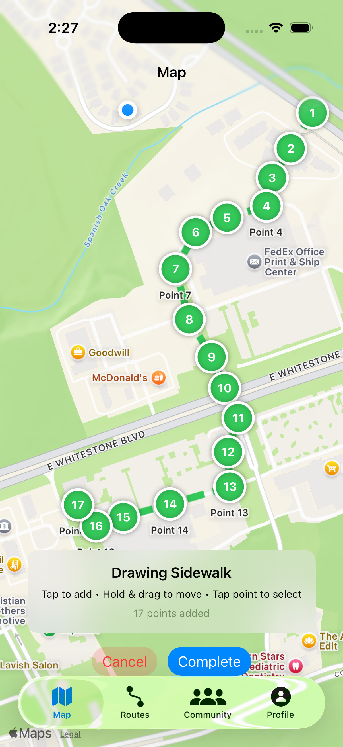 The core value proposition is crowdsourced sidewalk accessibility data. Users can report hazards like missing sidewalks, obstacles, poor conditions, ice, flooding, and construction. They can also document positive features like curb cuts and well-lit paths. This community-driven approach creates a living database of real-world accessibility information that traditional mapping services don't provide.